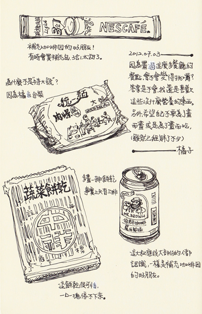 take a break 白天一口氣跑了幾個點,先是報名青田七六的導覽解說,導覽室免費的只要事先上網報名即可。跟著百合老師看了青田七六的裡裡外外,聽著馬廷英教授的故事和許多日式建築的巧思,深深覺得這些老建築當好好保存,而非任由凋零最終拆除(當然還得克服現實因素)。內部空間作為餐廳利用,下次考慮在裡面用餐應該別有一番風味。這讓我想到陽明山的草山行館,可惜遭祝融燒毀許多文物。午餐後到萬華剝皮寮街區,只有幾間空間有展出,沒有特展整條街顯得冷冷清清,只有三三兩兩的遊客和發放問卷的學生。稍後前往迪化街附近轉轉,霞海城隍廟依舊香火鼎盛。經過便利商店點一杯拿鐵吹個冷氣稍作休息,隨手畫下眼前的成列架。